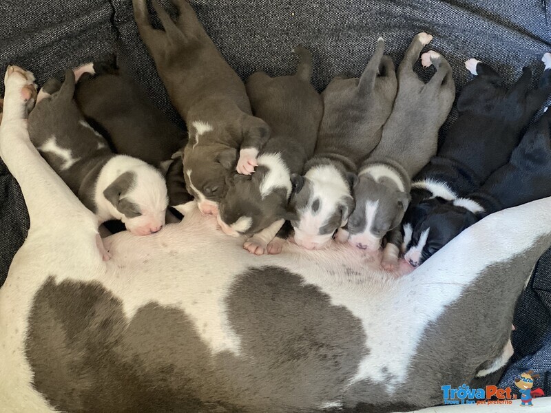 Allevamento professionale propone bellissimi cuccioli di Amstaff Blu ( American Staffordshire Terrier ) con pedigree ENCI. I cuccioli sono visibili assieme ai genitori in allevamento in zona Bari in Puglia. Sono disponibili maschietti e femminucce. I cuccioli sono ceduti al nuovo proprietario provvisti di libretto sanitario con vaccino, ciclo sverminazione, microchip, pedigree ENCI. Inoltre tutti