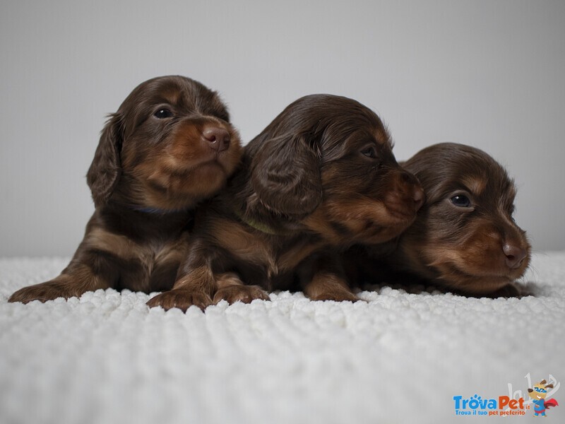 Si cedono, dopo i 70 giorni di età, cuccioli maschi di bassotto a pelo lungo (futura taglia nana) neri focati e color cioccolato. Con pedigree Enci-Fci e tutti gli adempimenti sanitari di legge.