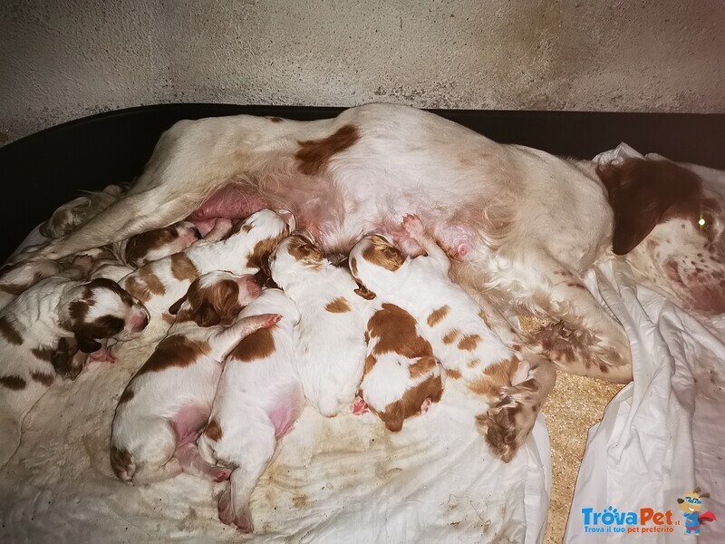 Splendidi cuccioli di Epagneul Breton nati il 26 Giugno con libretto sanitario, microchip, iscrizione Enci e Pedigree. 1 maschio e 1 femmina bianco/arancio e 7 maschi e 1 femmina bianco/nero. I cuccioli saranno disponibili a Settembre con possibilità di consegna in tutta Italia. Ulteriori info e foto su richiesta