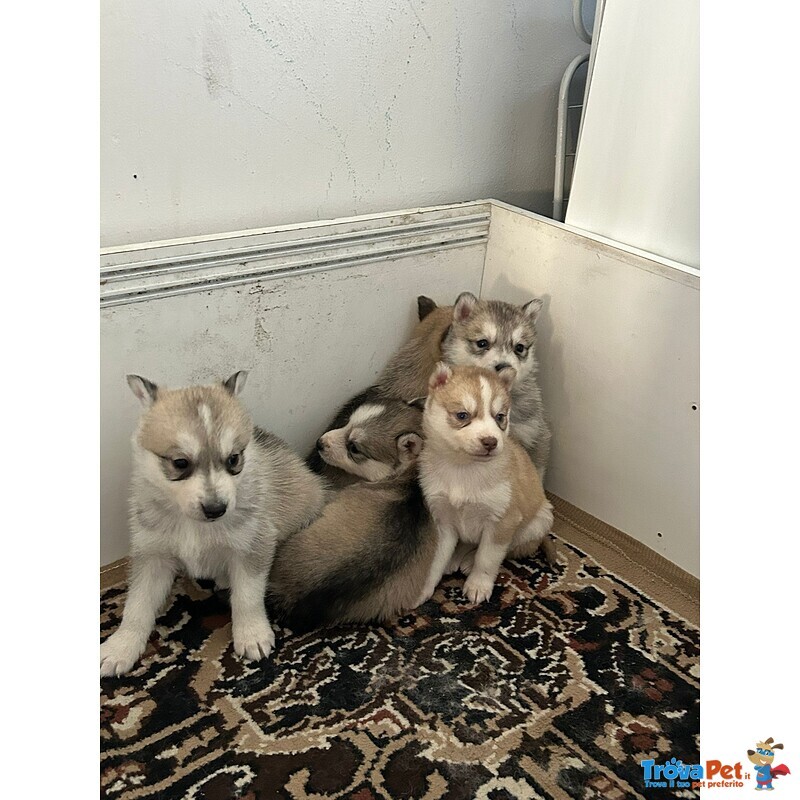 Vendo Cuccioli di Siberian Husky 5 maschi e 1 femmina, con sverminazione, primo vaccino e libretto, con occhi blu, verdi e differenti (uno sia blu sia verdi)