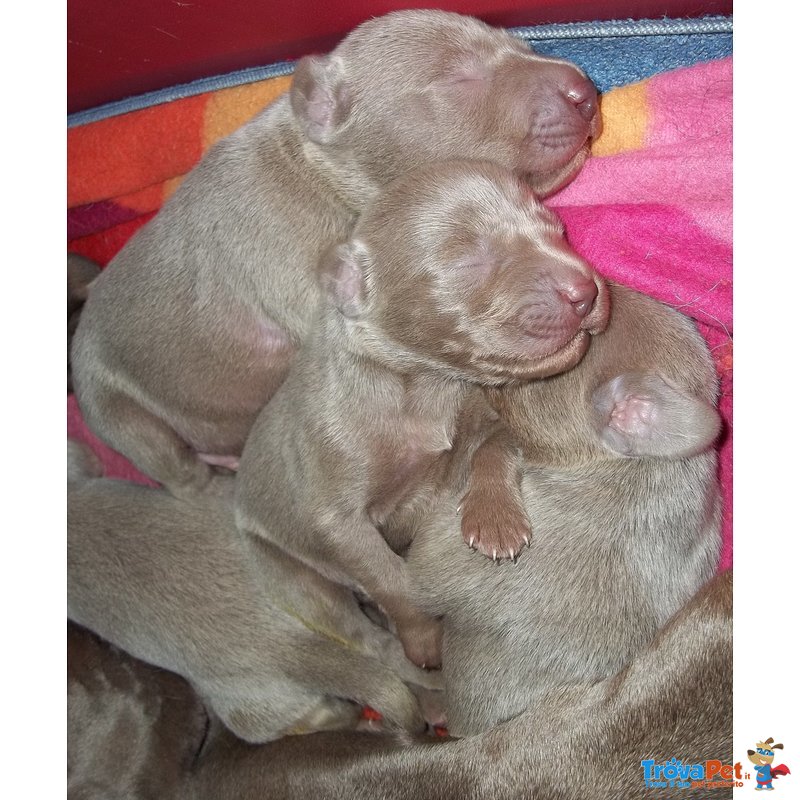 Abbiamo splendidi cuccioli di Weimaraner maschio che potranno far parte di nuova bella famiglia dal 18 dicembre prossimo . Sono con ottimo pedigree Enci , anche da parte di mamma Nina e Babbo Monet , esenti da displasia anca e gomito . Visibili , hanno un mese e sono splendidi . Trattativa privata .
