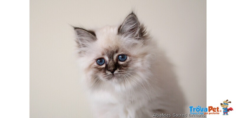 Disponibile cucciolina di gatto Sacro di Birmania , nata e cresciuta in casa sviluppa un carattere dolce ed equilibrato occhi di un blu molto intenso corpo chiaro ed estremità chocolate . Adatta a famiglie con bimbi e persone in cerca di una gattina da amare come nella nostra famiglia. Selezione di alta genealogia priva di tare genetiche e dalla salute forte, accompagnata da pedigree, tutti i