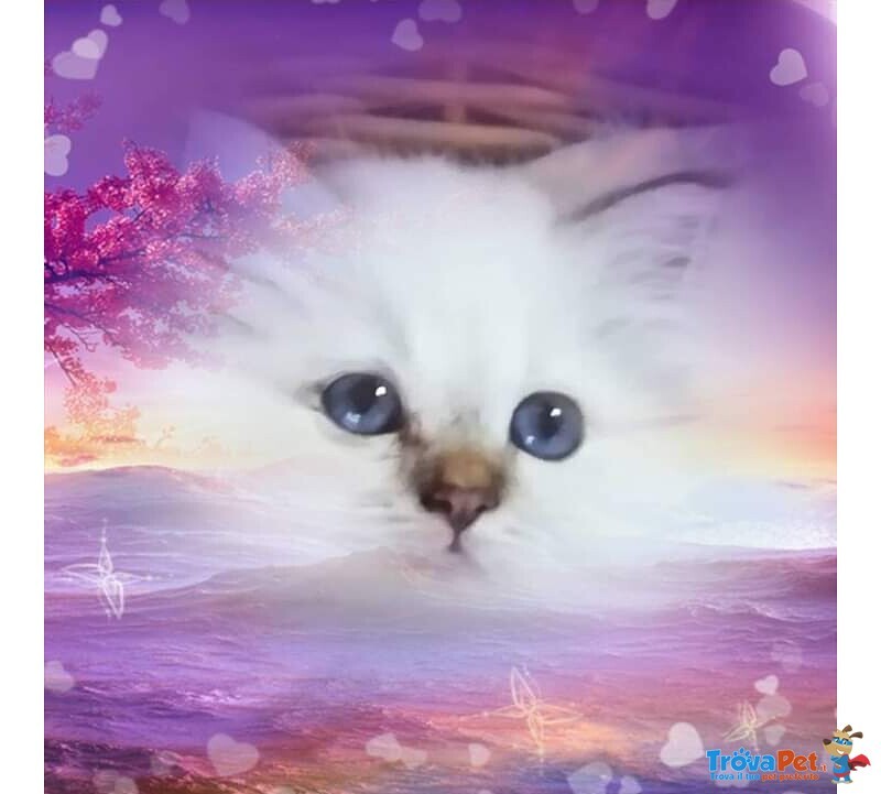 Disponibile cucciolina di gatto Sacro di Birmania , nata e cresciuta in casa sviluppa un carattere dolce ed equilibrato occhi di un blu molto intenso corpo chiaro ed estremità chocolate . Adatta a famiglie con bimbi e persone in cerca di una gattina da amare come nella nostra famiglia. Selezione di alta genealogia priva di tare genetiche e dalla salute forte, accompagnata da pedigree, tutti i